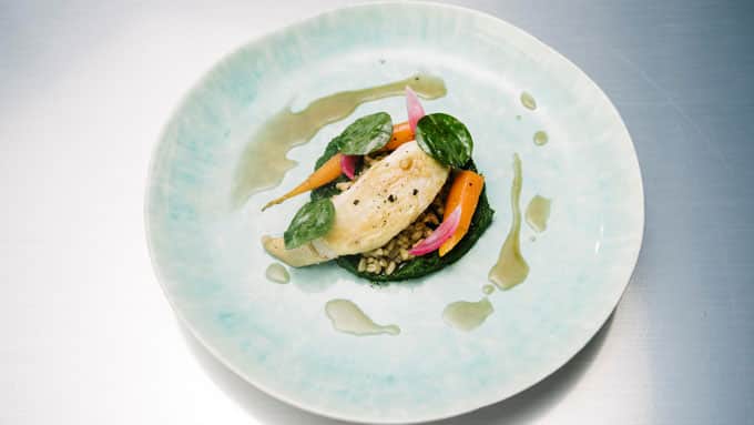Der ehemalige Tourmanager serviert "Hähnchen im Brotmantel gegart mit Zartweizen, Karotten & Spinat"...