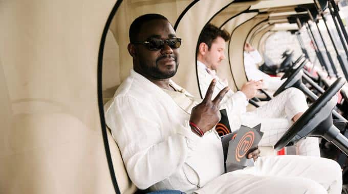 Nelson wartet ganz entspannt im Golf Cart auf die Kandidaten.