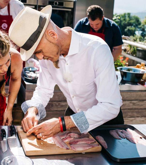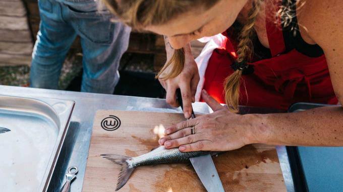 Ralf Zacherl zeigt Coco wie sie am einfachsten die Kräten aus dem Fischfilet entfernt.