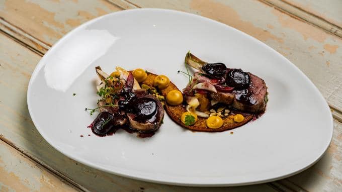 Tobias hat sich für die herzhafte Variante entschieden und ein Lammkarree mit Rotwein-Kirschsauce und Fenchelsalat kreiert.