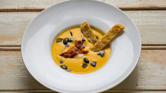 Lisa wollte unbedingt mit Ingwer arbeiten. Der ist in ein herzhaftes Gericht leicht zu integrieren. Maria über Lisas Ingwer-Kürbissuppe mit pochiertem Ei und Ingwer-Pfannenbrot.: "Das ist ein wahnsinnig banaler Teller, der mich in seiner Einfachheit nicht vom Hocker wirft."