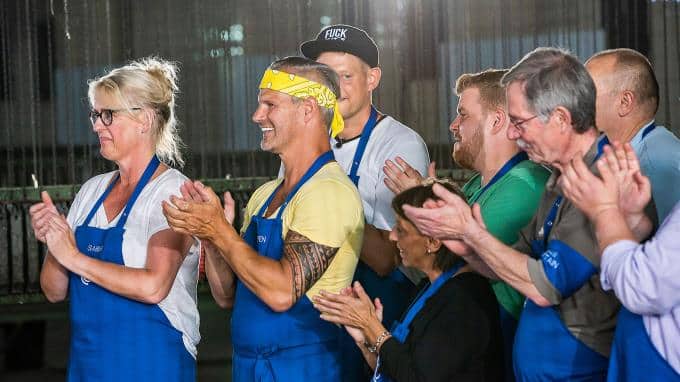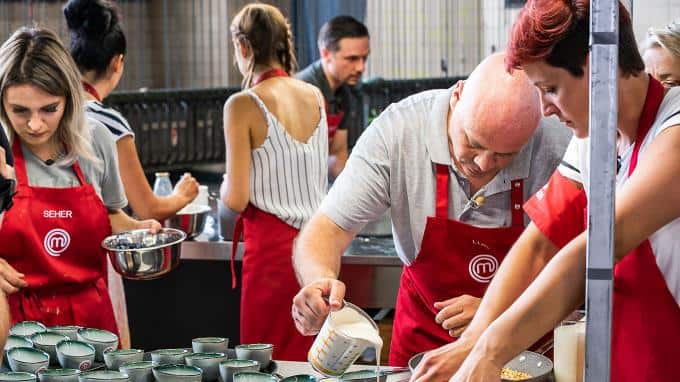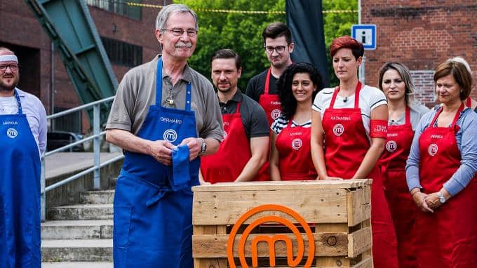Die MasterClass steht vor ihrer ersten großen Außen-Challenge. Für jeden Kandidaten liegen Schürzen in beiden Teamfarben bereit. Ralf teilt die Teams ein.