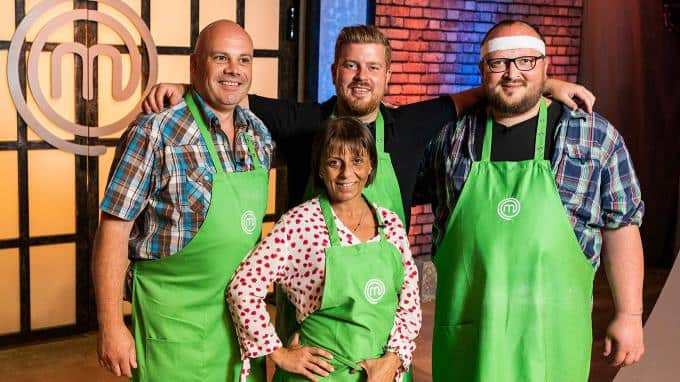 "Vier Fäuste für ein Halleluja"? Was für ein Film geht denn heute in der "MasterChef"-Küche ab? Die große Team-Kochstaffel wird den Kandidaten heute alles abverlangen. Team Rot mit einem Hahn im Korb: (von links nach rechts) Sabine, Katharina, Renato, Katja