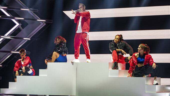 Auch mit seiner Performance und seinem deutschen Song "Los" kann er die Jury und das Publikum begeistern. (© Silviu Guiman/Sky/UFA)